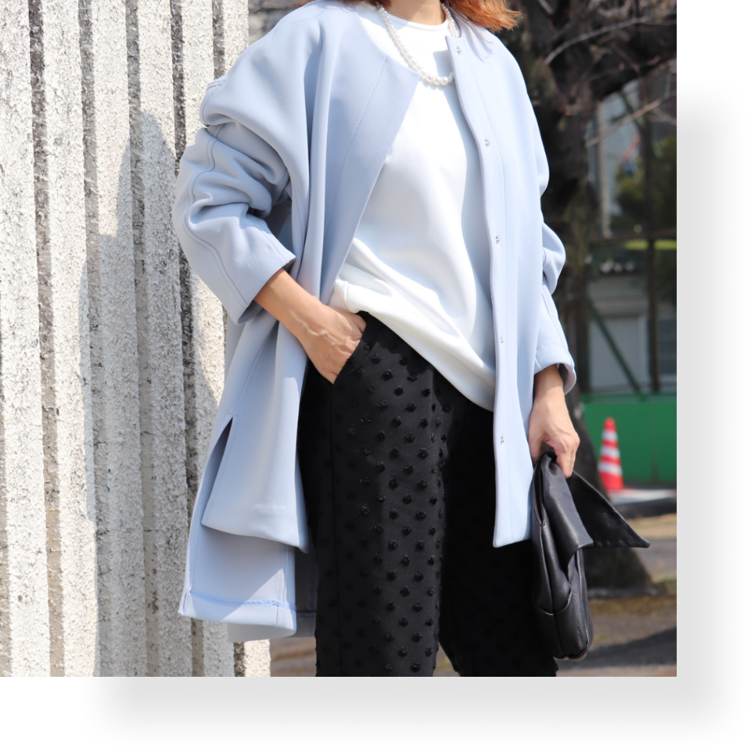 ライトな素材感で裏地もないので重たくならずオールシーズン使えるアイテム。ストレッチがあり着心地良く、きれい見えします。