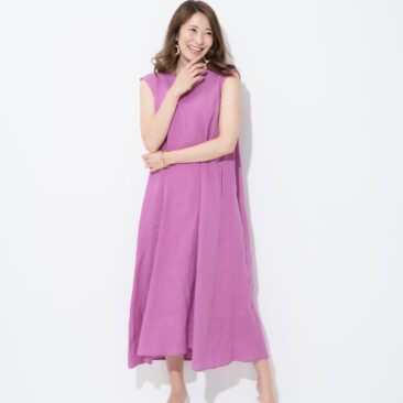 裾にかけて広がるシルエットがフェミニンな印象のワンピース。背中の長めに垂れるリボンがポイント。